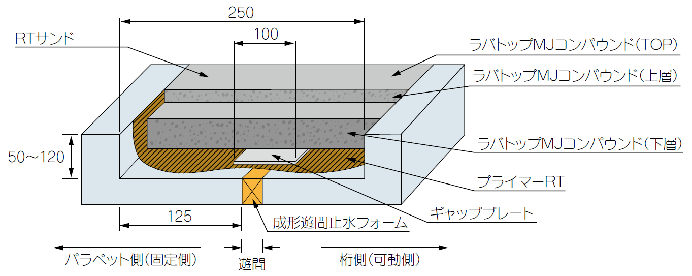 - ・伸縮部に独自止水フォームを設置し、上部に特殊アスファルト合材を敷設する構造。
