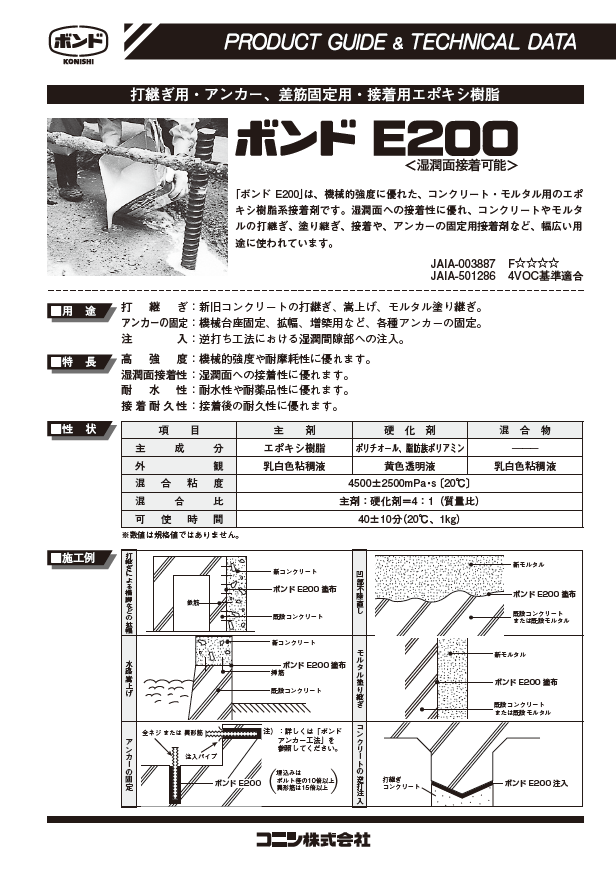 機械的強度に優れた、コンクリート・モルタル用のエポキシ樹脂系接着剤。 湿潤面への接着性に優れ、コンクリートやモルタルの打継ぎ、塗り継ぎ、接着や、アンカーの固定用接着剤など、幅広い用途に使われている。