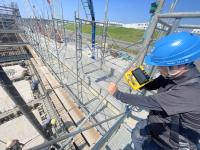 型枠内側や鉄筋部に番線を用いてセンサを固定。Node(子機)はマグネット着脱式なので、型枠付近の鋼製足場の建地部に装着。(落下防止の為、インシュロックなどを用いて固定。)