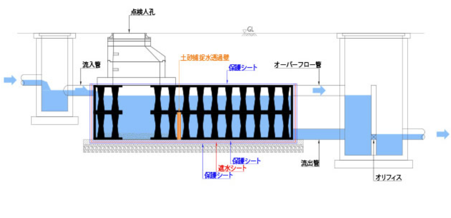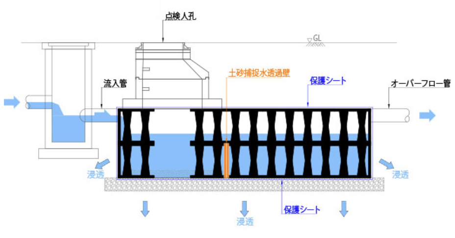 ・空隙率93~95%を有し、使用するシートや流入出施設の組合せにより貯留・浸透のいずれにも適用可能。
