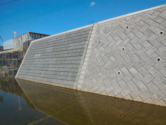 ブロックを積み上げて、コンクリートを充填することで一体化が図れるので、施工の省力化と工期を短縮することができる。