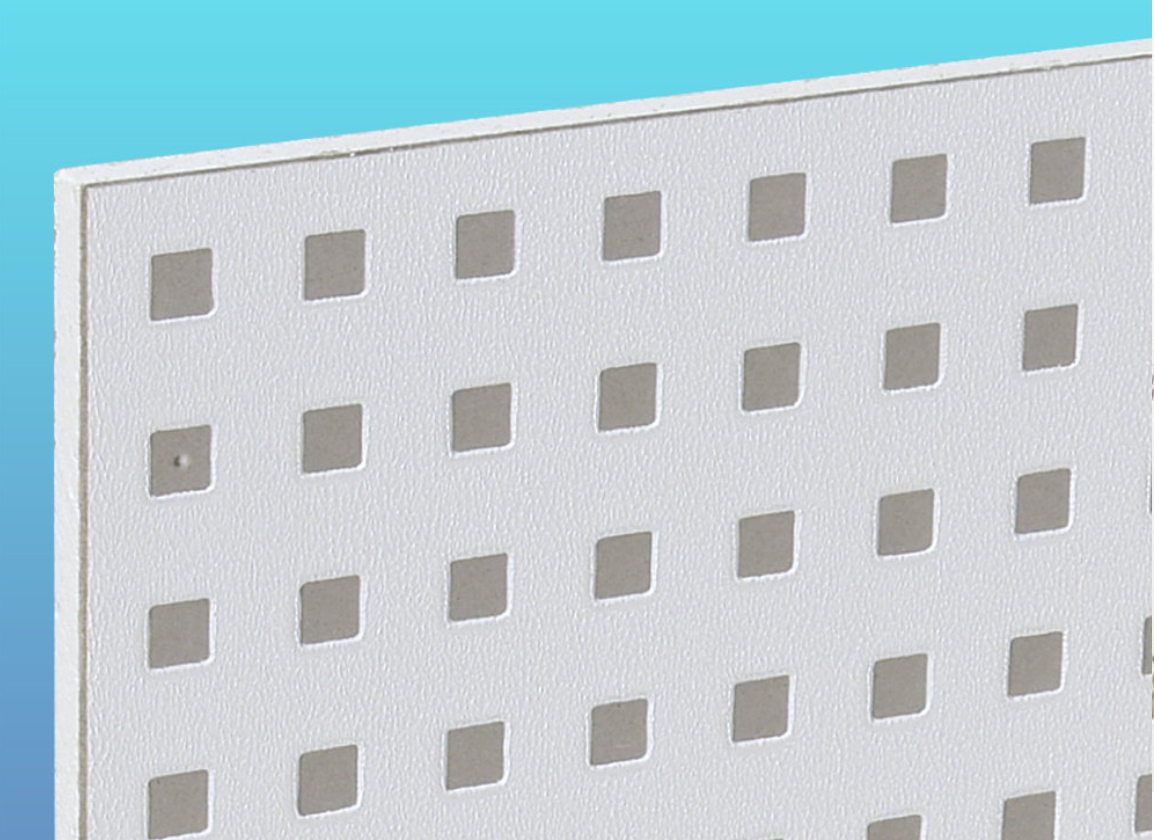 直張り化粧天井ボード。ホルムアルデヒド吸収分解する。 凹み部に専用ビス留めすることで、ビスが目立たなく意匠性を損ない。現場での目地処理や塗装仕上げが不要となり、工数および業種を減らせる。不燃材料ですので内装制限を受けない。