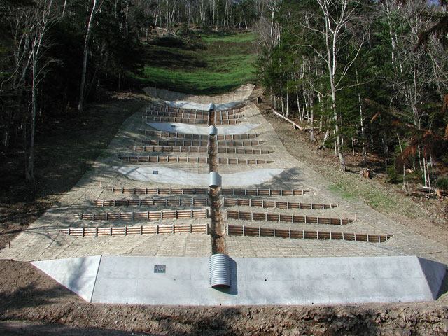 ・ワラゴモに、鉄線入り植生基材袋と金網を装着した多重構造で、積雪・凍上に強い。