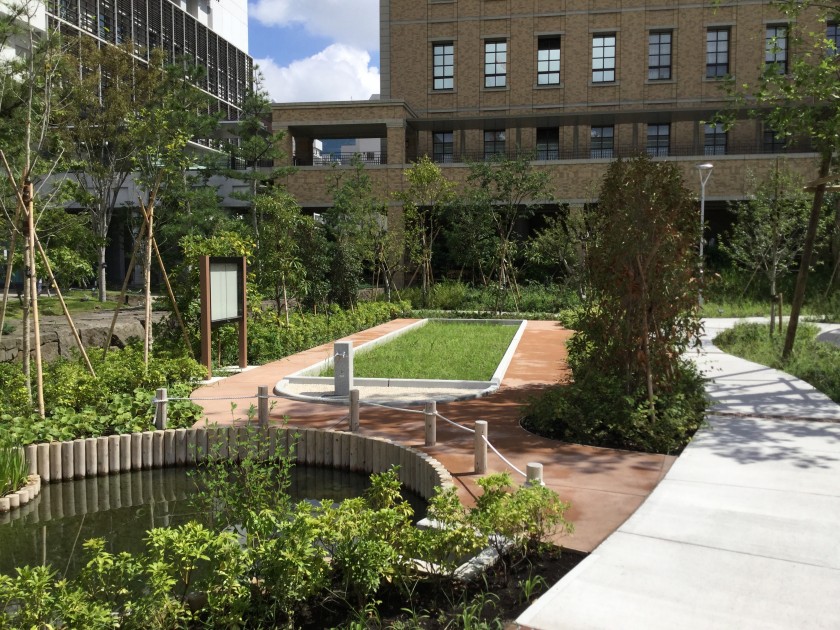 骨材の空隙により保水性に優れ、降雨後表面からの蒸散作用で樹木や草花に潤いを与える環境舗装。