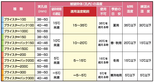練混ぜタイプ以外にも横孔・水中破砕向けとしてパックタイプや大孔径タイプ(下表でCの付いている品種)を別途品揃えしている。