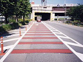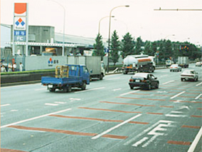 ポリアミド樹脂を使用することで塗膜の変形が少なく、長期にわたりすべり止め効果を持続する。非常に過酷な状況である、信号機のある交差点手前30mでも潰れにくくすべり止め効果を維持する。