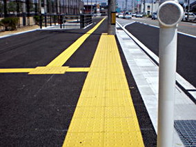 アトムセフティーガイドは耐候性に優れた特殊熱可塑性樹脂を採用し、特殊骨材を配合しているため耐摩耗性に優れるとともに、安心して雨天時に歩行できるように配慮されている。また、線状(誘導)標示を連続成型する施工方式を採用しているので、短期間での施工が可能となった視覚障がい者誘導用標示材である。