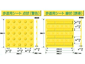 アトムセフティーガイドシートは、耐候性に優れた視覚障がい者誘導用シートである。施工は舗装を掘削する必要がなく、専用の速乾型接着材を使用することにより早期の開放が可能となる。このため工期・規制の短縮ができる。必要に応じて300mm×300mmの一連式と、300mm×600mmの二連式を選択できる。