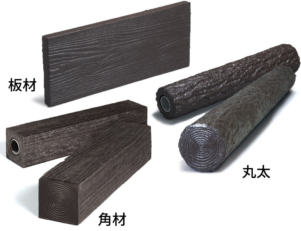 天然木のテクスチャーとプラスチックの耐久性・軽量性を併せ持つロングセラー商品。プラスチック単体の板・杭・階段等と、亜鉛メッキ鋼管を芯材にした丸太・角材がある。各種設計条件に合わせて、適宜選択可能。