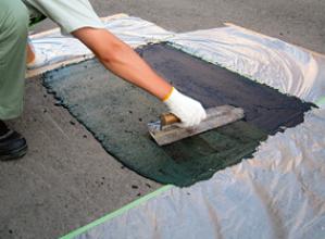 粉体と樹脂の混合には、特殊な道具を必要とせず、手もみで簡単に行える。混合物は柔らかいので、コテのみで簡単に均すことができる。