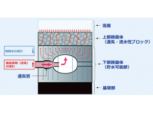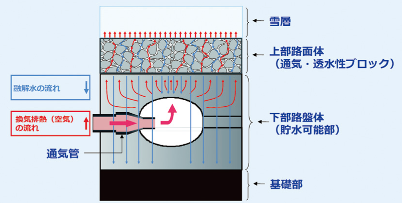 透水(通気)性で空気吹き出し可能な路面体とその下部は貯水可能な空洞体の路盤体で構成され気候変動(大雪・大雨・暑熱)に対応する構造体である。 送風機使用のみで省エネ・経済的・環境に配慮。 構造が単純で施工性に優れリデュース(Reduce=ごみの発生抑制)、リユース(Reuse=再利用)、リサイクル(Recycle=再資源)が可能。