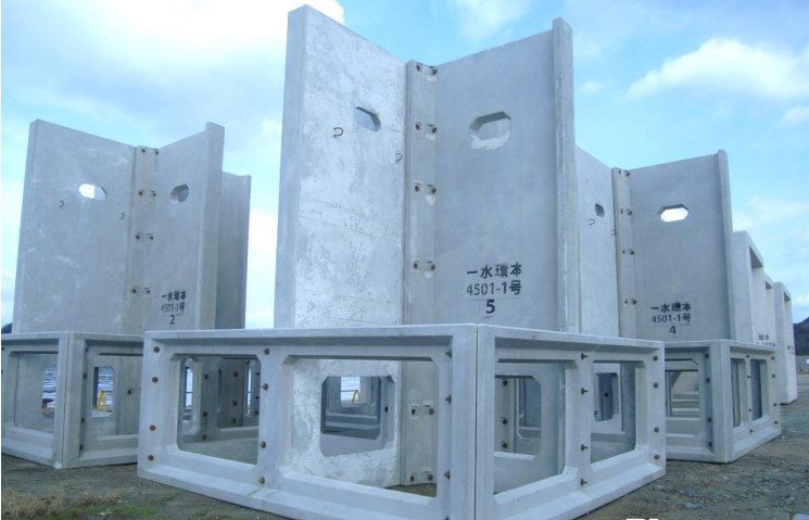 ①中央板と側板の2種類の部材で構成された、ボルト結合によるコンクリート組立礁。