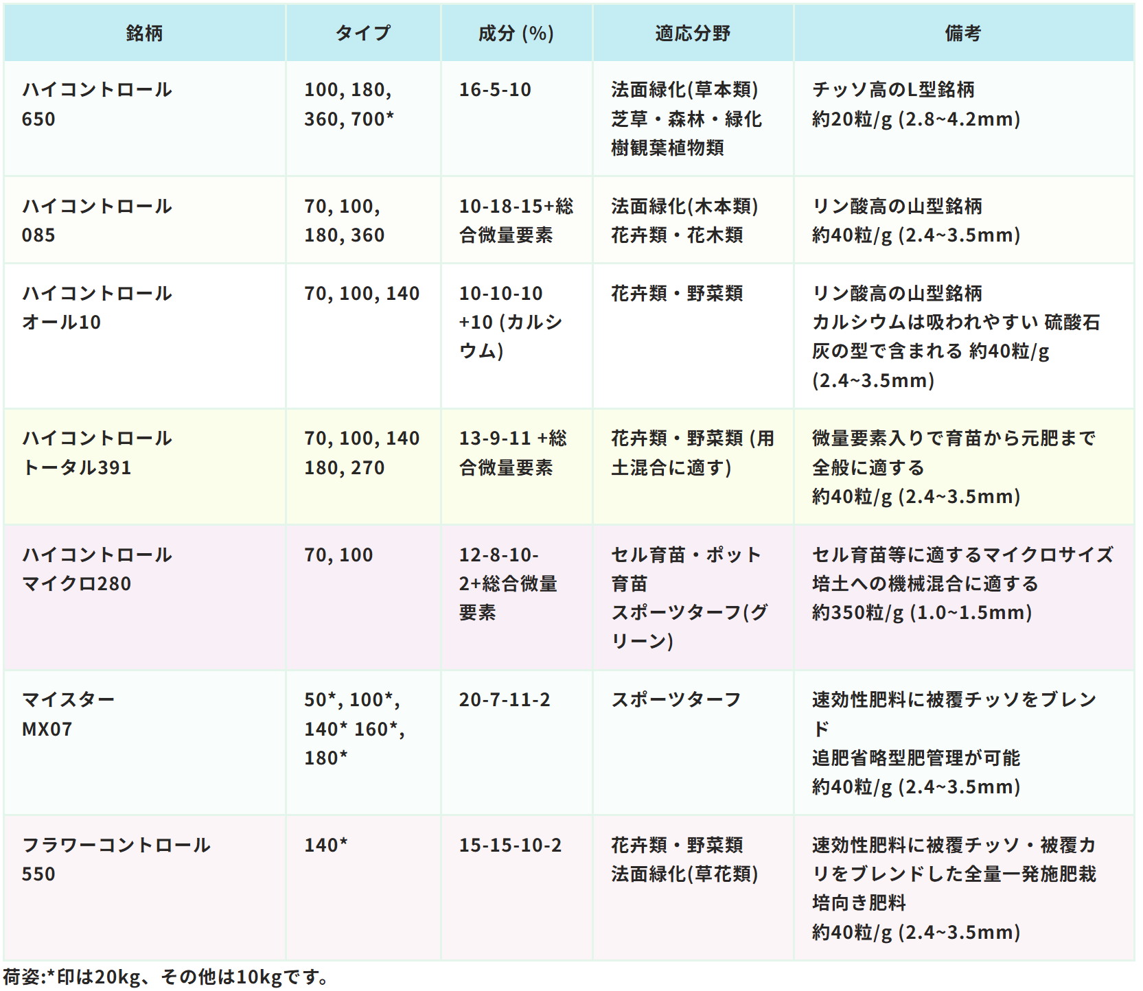1.各種溶出タイプがあるので施肥時期、希望肥効期間、適用分野などを考慮して最も適したタイプを選択できる。
