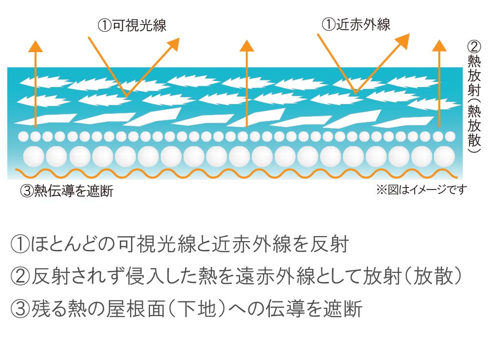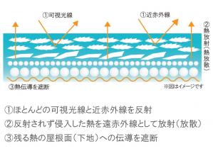 NASA開発の特殊セラミックを含有した遮熱・断熱塗料。 含まれるセラミックが太陽光の熱エネルギーを反射・放散させることにより、建物内の室温を5~7℃させ、夏場の空調電力使用量を最大40%削減する。