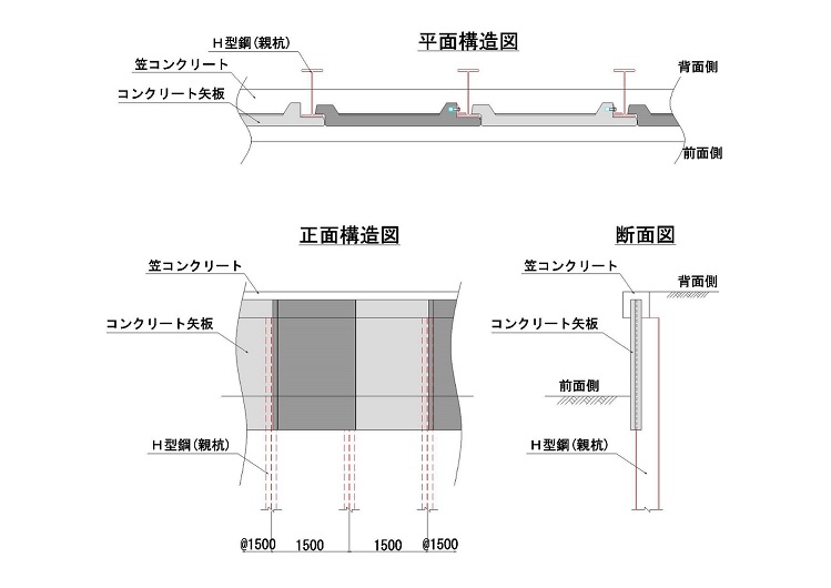 土留壁をコンクリート矢板の単体構造から、H形鋼とコンクリート矢板の複合構造に変えた。
