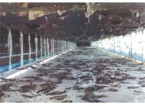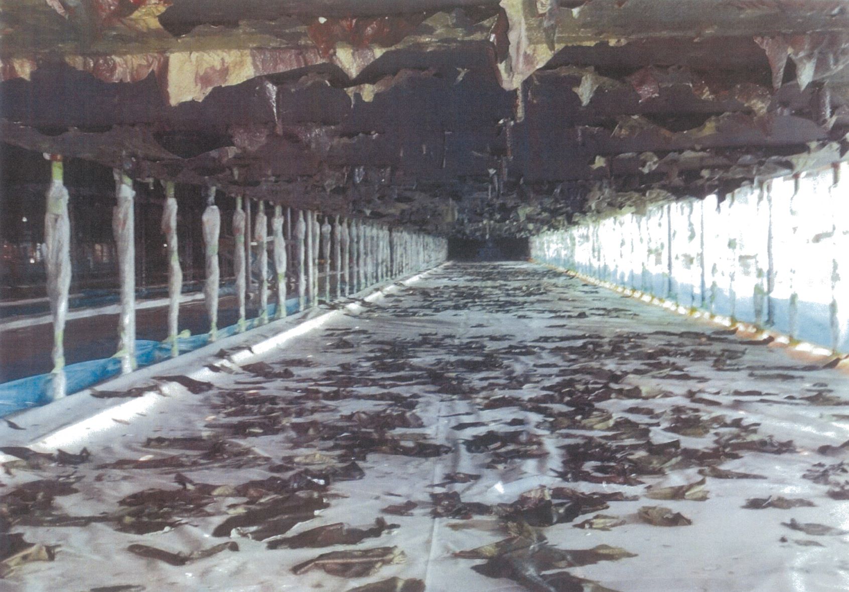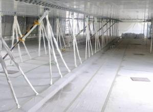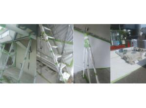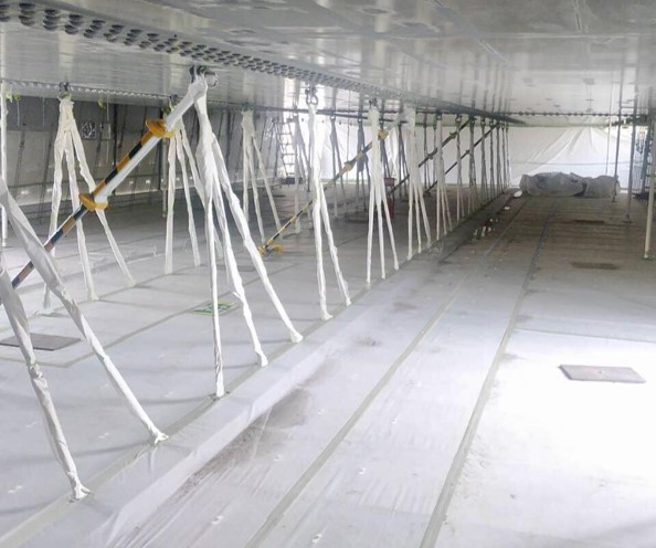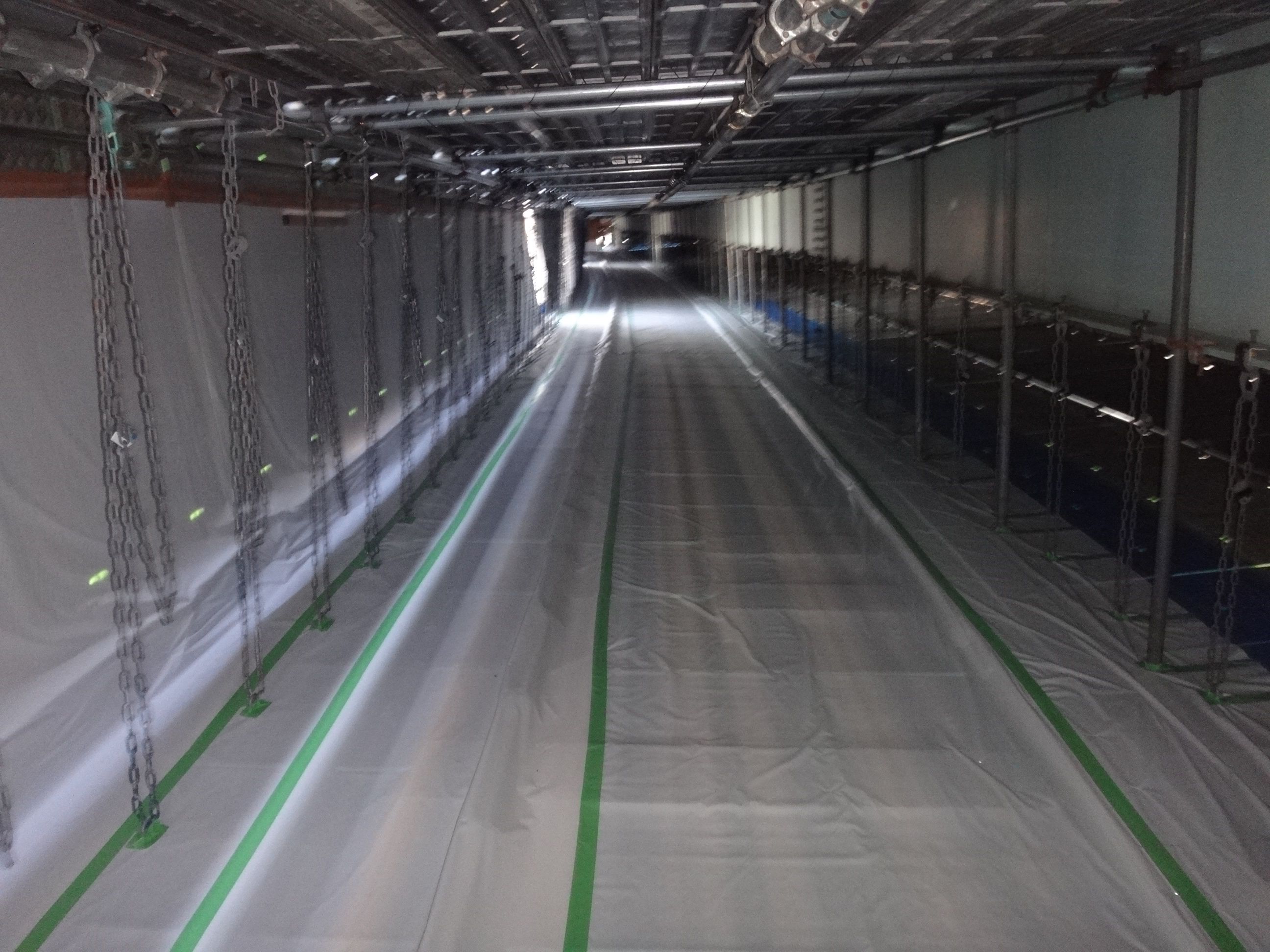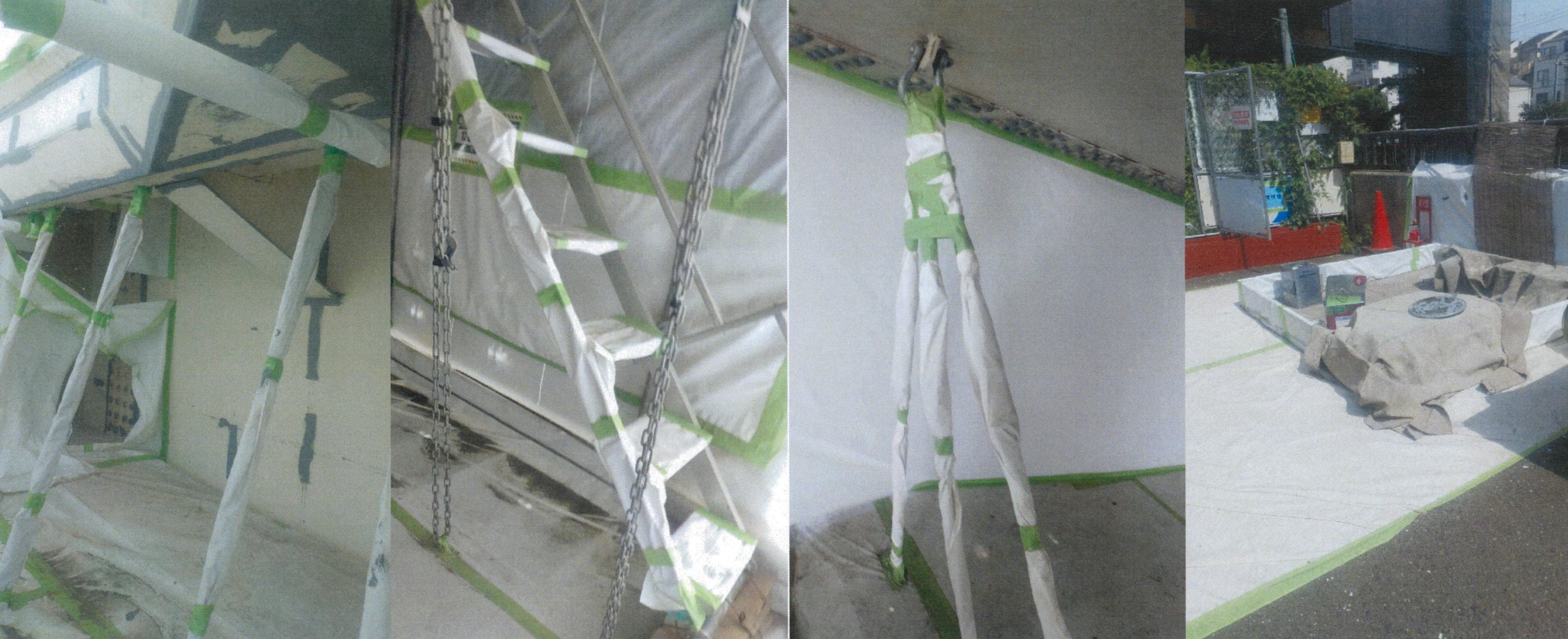 ・塗装時の養生を従来の塩ビ製防炎シート(330g/㎡)とポリエチレン製保護フィルム(45g/㎡)の2枚重ねから、軽量のポリエチレン製防炎クロス(108g/㎡)1枚の使用とした。
