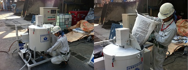 | 施工後の評価 | 一日200m3近い数量を毎日打設するも、投入人工も1名削減でき、省力化・省人化できたと評価頂いた。また、正確な流量計と電磁弁による数量管理とホース内残分も圧縮空気ですべて投入できることから、品質も安定していた。 |