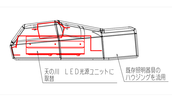 光源を高輝度LEDとし、既存照明器具を流用し、内部ユニットのみの交換とした。