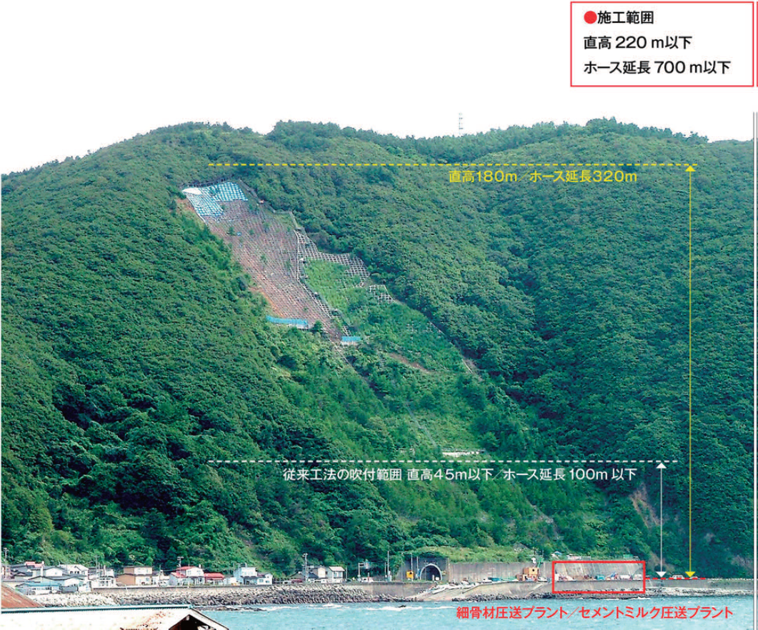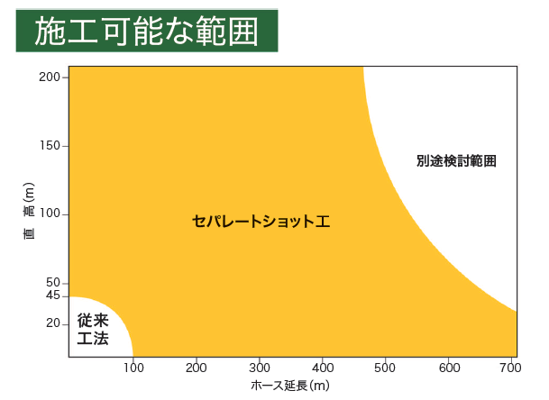 ・従来工法では施工機械の移動をやむなくされていた長距離(ホース延長700m以内)、高揚程(直高220m以下)の吹付が機械の移動をすることなく施工できる