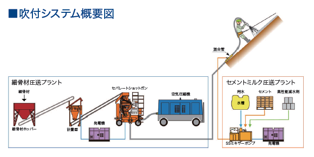 ・施工のり面まで材料を別々に圧送し、施工のり面手前で混合して吹き付けるため、材料分離がなく品質の安定した吹付を実現