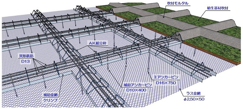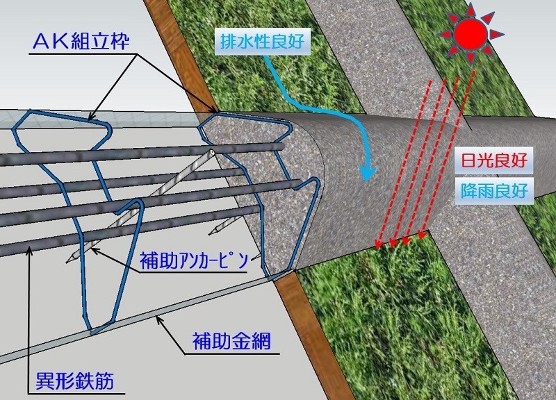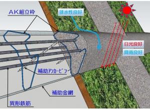 ・AKフレーム組立枠と補助金網を軽量化したことにより運搬性と施工性が良くなることから工期短縮を期待する現場に有効である。