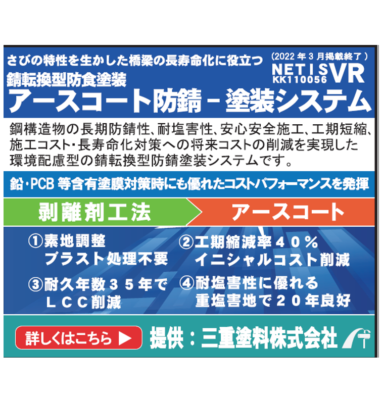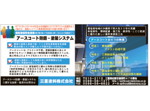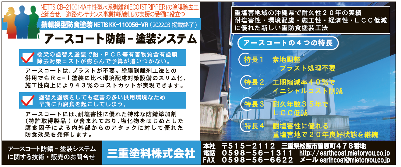 ・アースコートシステムの効果:鋼構造物の長期防錆性確保、VOCの低減化、工期の短縮化、メンテナンス期間の延長化ができ、更には耐塩害性の向上が期待できる技術である。また、ブラスト処理の必要が無いため、動力工具処理は対応可能業者が多く、人手不足問題も解消できる。