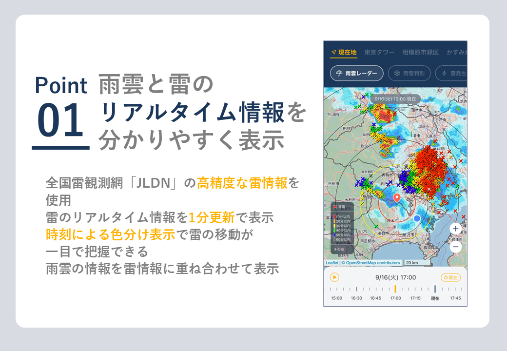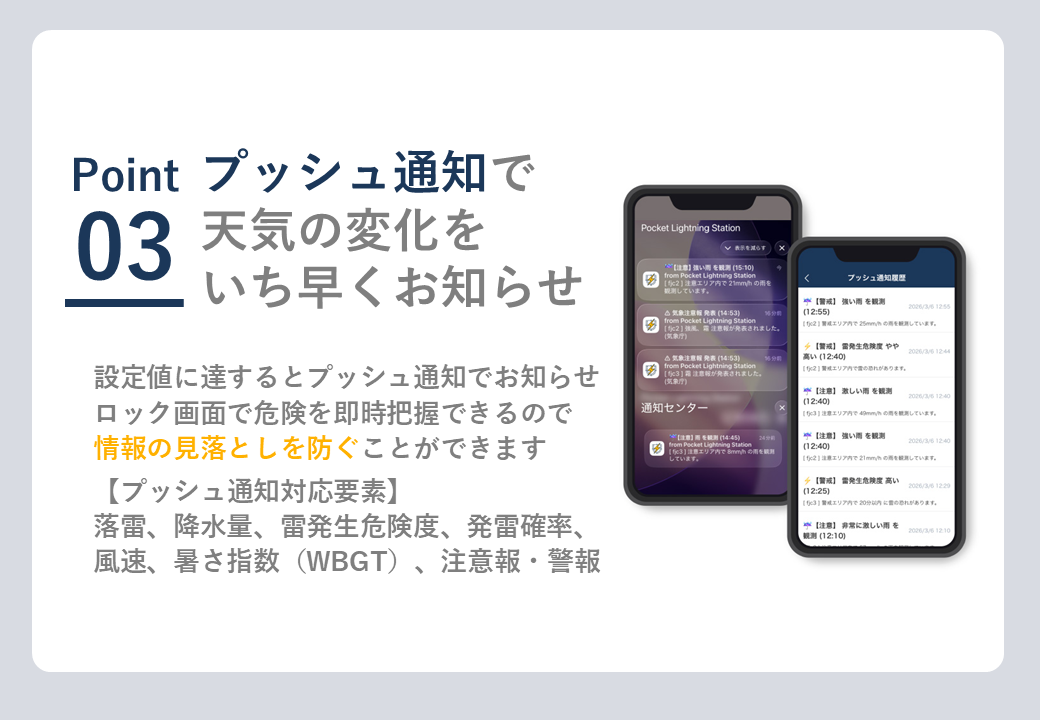 ■プッシュ通知による情報取得により、落雷や大雨の危険情報の迅速な取得が可能となり安全性の向上が図れる。