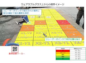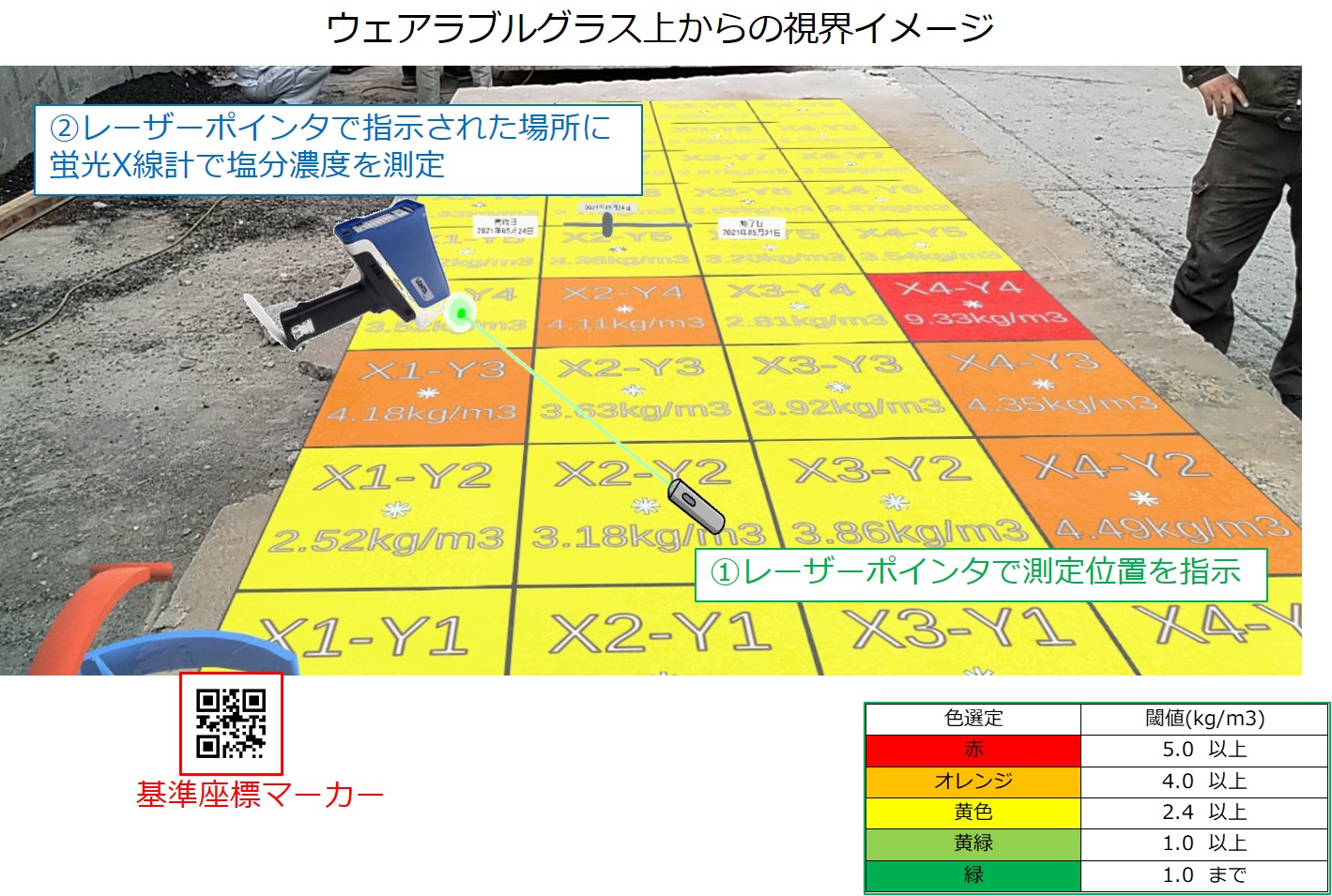 ・蛍光X線分析法によるコンクリート塩分濃度測定結果をウェアラブルグラス上でヒートマップ表示し、コンクリート塩分濃度の分布が一目で可視化できる。