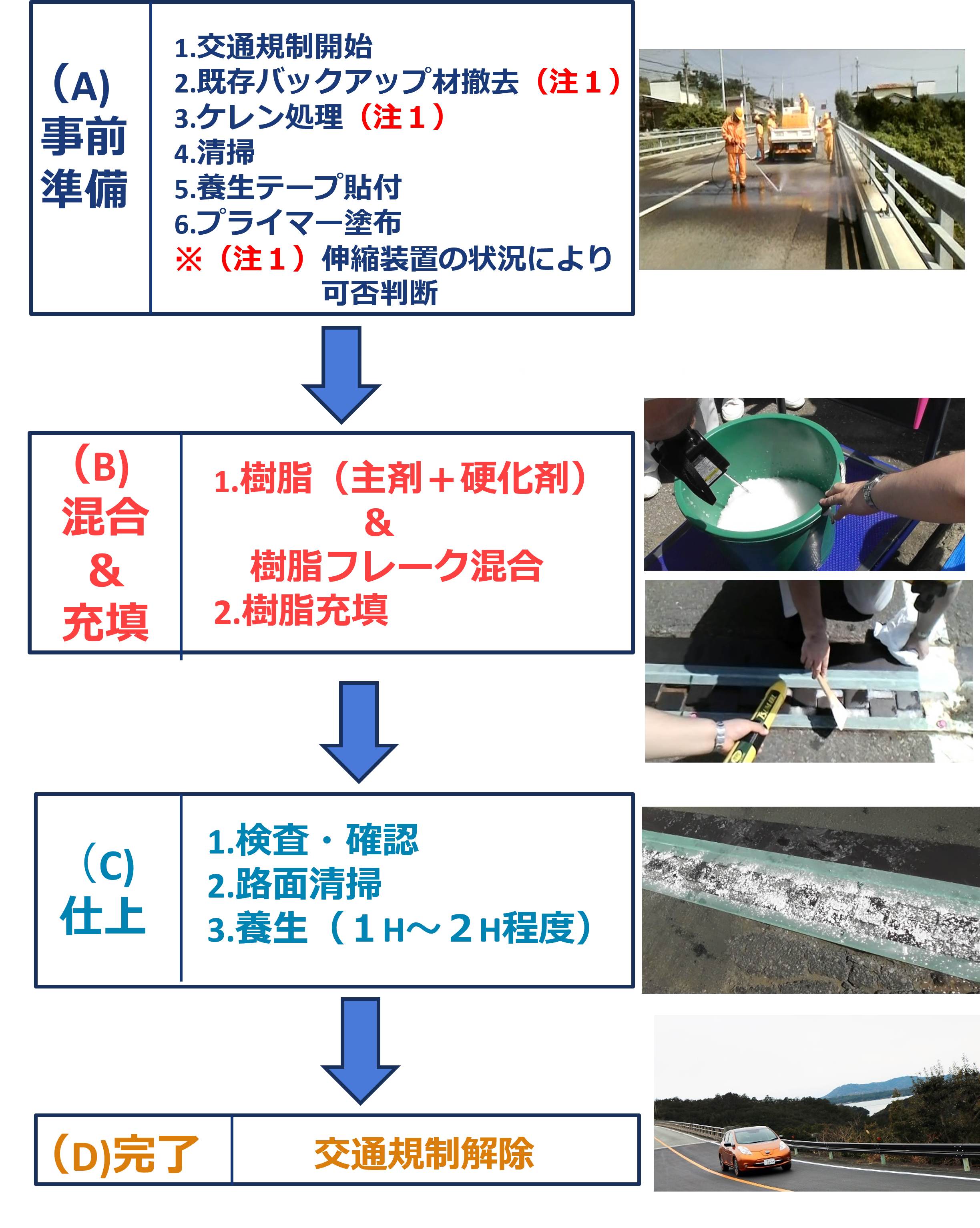 ・施工前に伸縮装置内の埃、泥などを綺麗に清掃すること