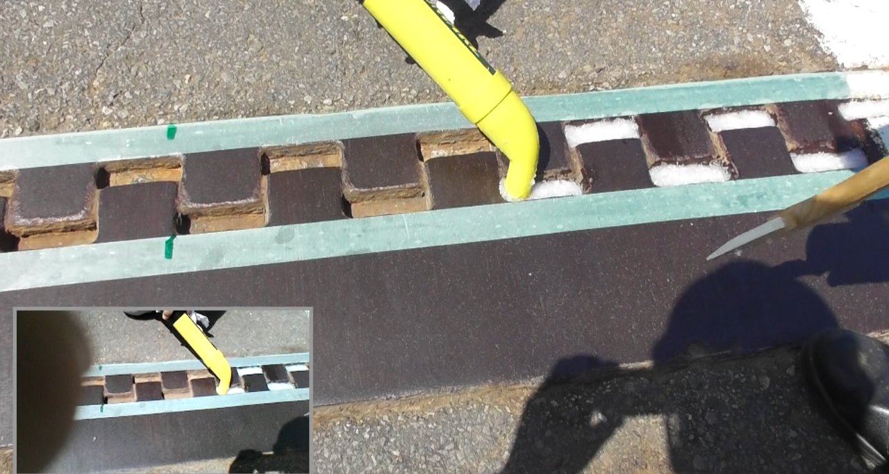 ・繰り返し車輛通行及び経年劣化により樹脂が剥離した場合、損傷箇所に再度ジェラフィンを充填することで止水機能が回復。