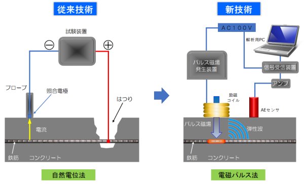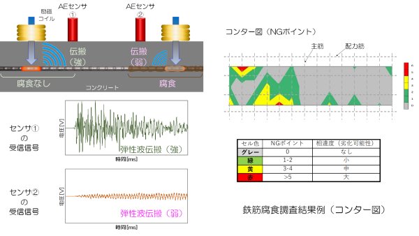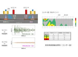コンクリート内の鉄筋腐食診断を、コンクリートをはつって鉄筋を露出させる電気的な調査方法から、非接触で鉄筋を加振して発生した弾性波を解析する方法に変えた。