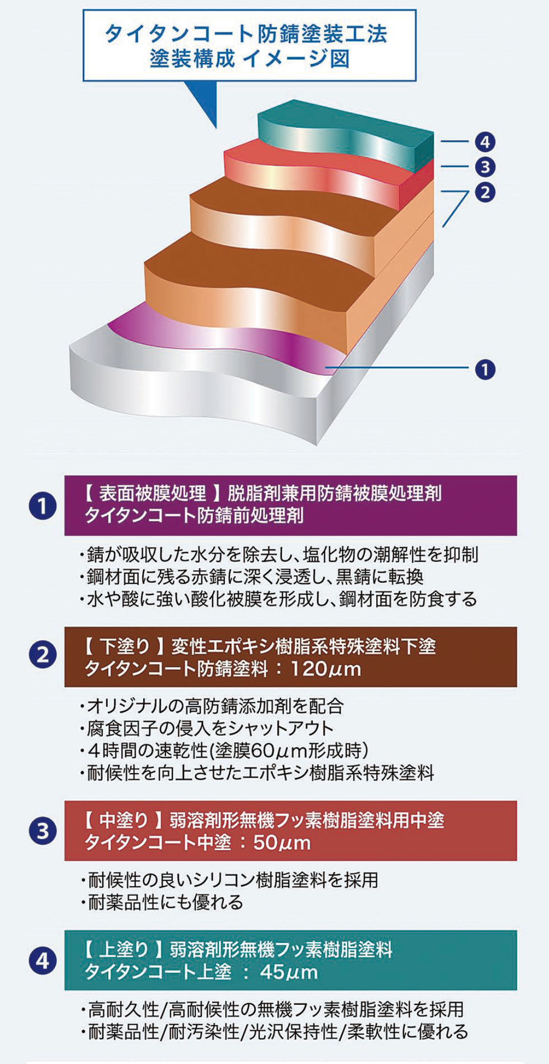 ● 防錆層に錆転換機能を付与し、保護層に耐塩害性のある無機成分をもつ塗料を採用し塗膜厚を厚くした。