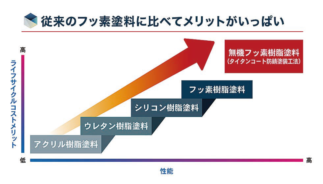 ・錆転換機能及び無機成分を付与し塗膜を厚膜にすることで、期待耐久年数が向上し、ライフサイクルコストを縮減できる。