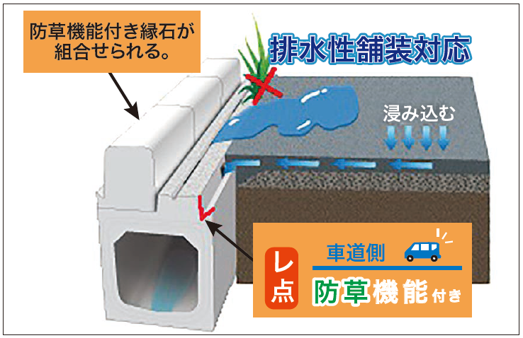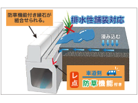 側溝表面であるエプロン部を無地よりすべり止め機能として、模様付き( 標準・タイル) に変更、また、エプロン部の幅を従来からの500mm から185mm 変えた。
