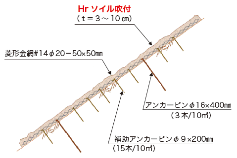 ・自然環境に対して無害な材料を使用するために撤去の必要が生じた場合でも、菱形金網を取り除き細かくすることによって植栽土や盛土材として再利用可能となり、産業廃棄物にならない。(産業廃棄物の発生抑制)