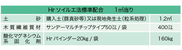 ・使用材料に真砂土などの自然土や木材チップを加工した木質繊維資材、および固化剤として環境に無害な酸化マグネシウムを使用する。(酸化マグネシウムは、肥料、医薬品、食品添加物としても利用されている自然環境に無害な材料)