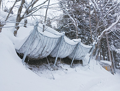 高強度のネットとワイヤーロープを主部材とした柔構造の雪崩予防の技術