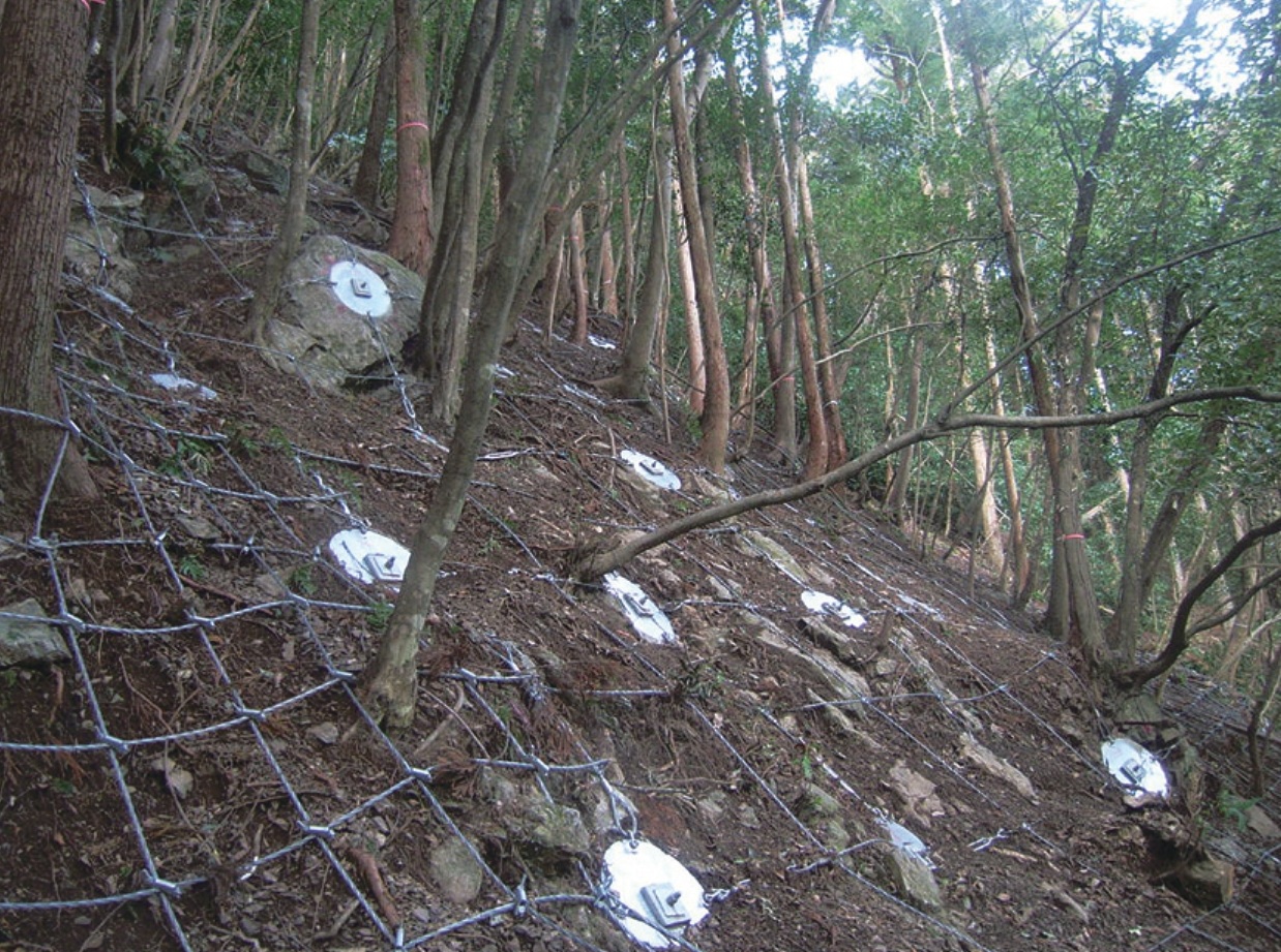 アンカーボルトを不安定地層の下にある安定馳走に定着させ、アンカー上部に設置された支圧羽根板をワイヤロープで連結することにより、斜面全体を安定させ崩落を予防する技術である。