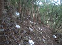 高所急傾斜地のアンカー工にて、ワイヤーと梯子で移動するエアー削孔機を使った工法