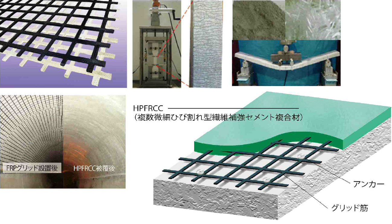| 施工後の評価 | 水路トンネル表面をHPFRCCに置き換えたことで耐摩耗性に優れた表面となっている。また、FRPグリッド筋の配置によりトンネル断面が補強され、耐久性も向上している。 |