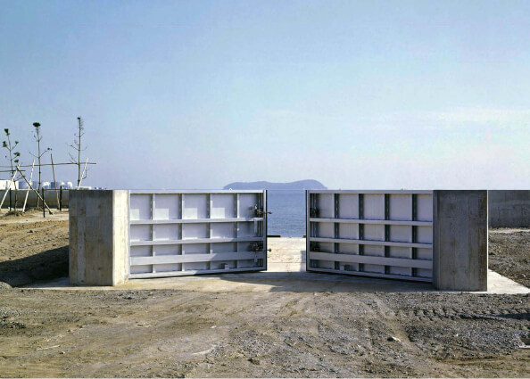 水害時の水の流入を未然に防ぐ防潮堤について、浮力により自動的に開閉し、起立時に波浪から受ける衝...