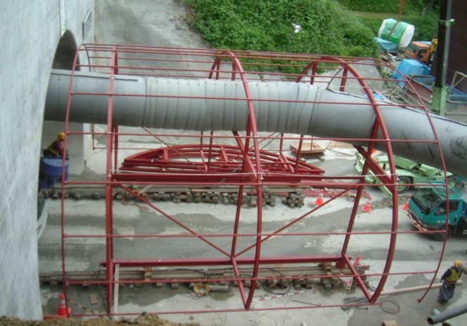 ①覆工表面から400㎜程度離して本体骨組みを設置し、外周部全面にシートを張り、