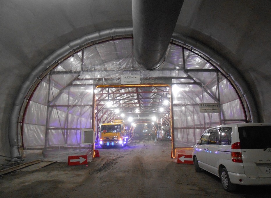 ②トンネルミスト端部はエアバルブを送風機により拡げて、覆工コンクリトーと