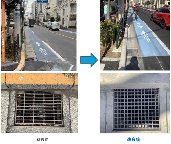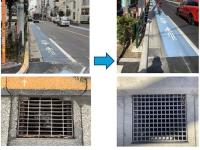 ・グレーチングの網目を格子形状(細目)から正方形(□35×35)に変更し、従来どおりタイヤのはまり込み防止効果を維持しつつ、主部材(メインバー)の間隔を広げた構造とした。