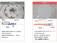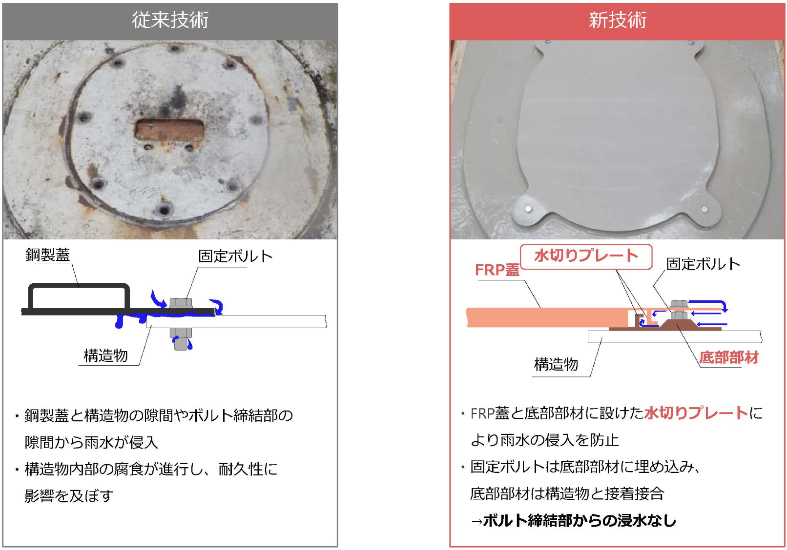 ・ゴムパッキンを省き、水切りプレートを設けた構造に変更したことにより、蓋を固定する際のボルト締め付け具合によらず安定した防水効果が得られ、施工性の向上(作業者の難易度軽減)が図れる。
