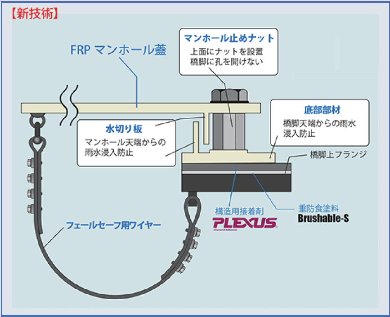 ・固定方法を変更したことにより、構造物のボルト貫通穴がなくなるとともに接着剤による接合で雨水の侵入経路がなくなり、橋脚・桁の腐食対策に繋げ、品質(構造物の耐久性)の向上が図れる。