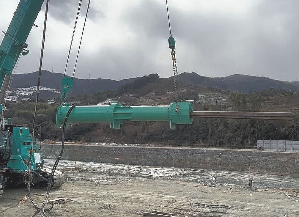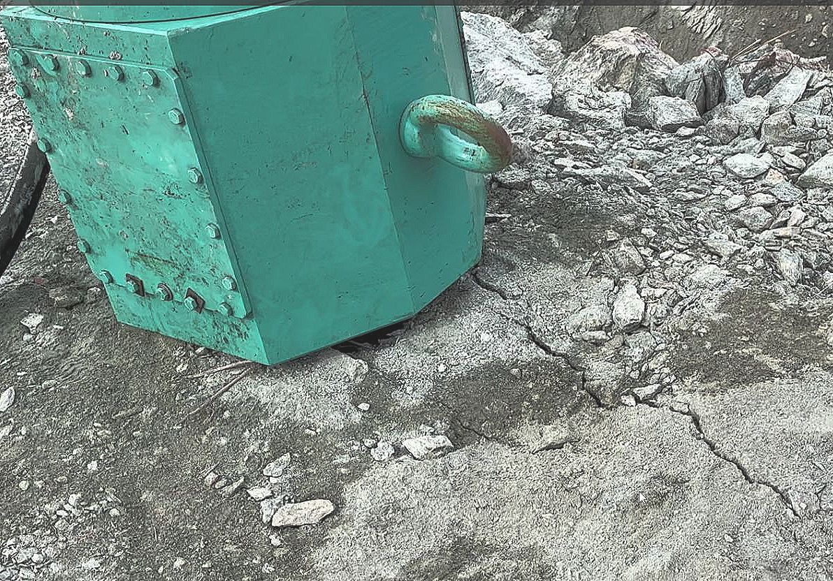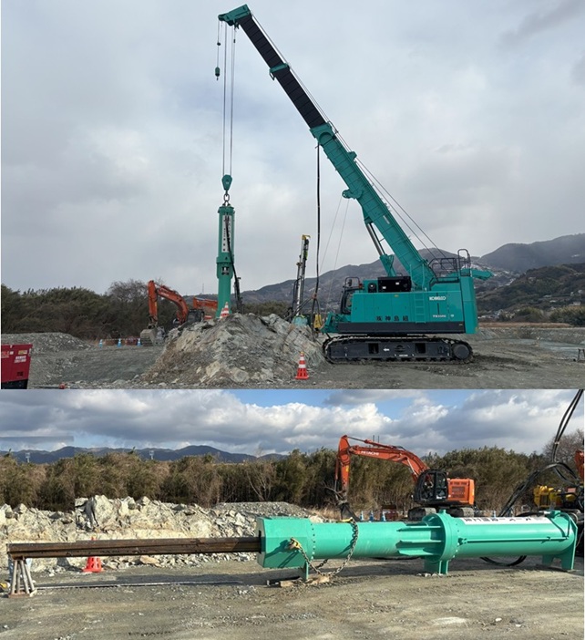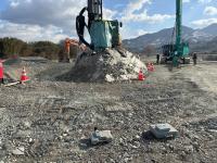 ・従来の大型ブレーカ掘削は岩盤を破砕する場合、亀裂部分を探しながら亀裂を叩き広げ破砕していくが、岩盤が硬質になるにつれ亀裂がなくなり破砕する効率は極端に落ちる。(特に硬岩Ⅱ以上の岩盤はチゼルが溶けだしほとんど破砕は不可能になる)本技術は大きな破砕力(割岩力:35,000t)を有するため1軸圧縮強度 153Mpa(1,920kgf/cm2)以上の硬岩Ⅱも破砕できる。