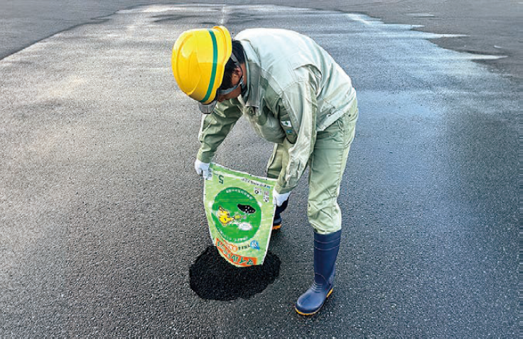 ・水分と反応する添加剤を加えたことにより、従来の常温合材と比べて高い耐久性が得られる(従来技術は揮発成分(鉱物油、溶剤等)を含んでいるため、高い耐久性が得られない)。また、雨天時における施工に際しても油膜が発生しないため、施工箇所の周囲に油などが流出しない。