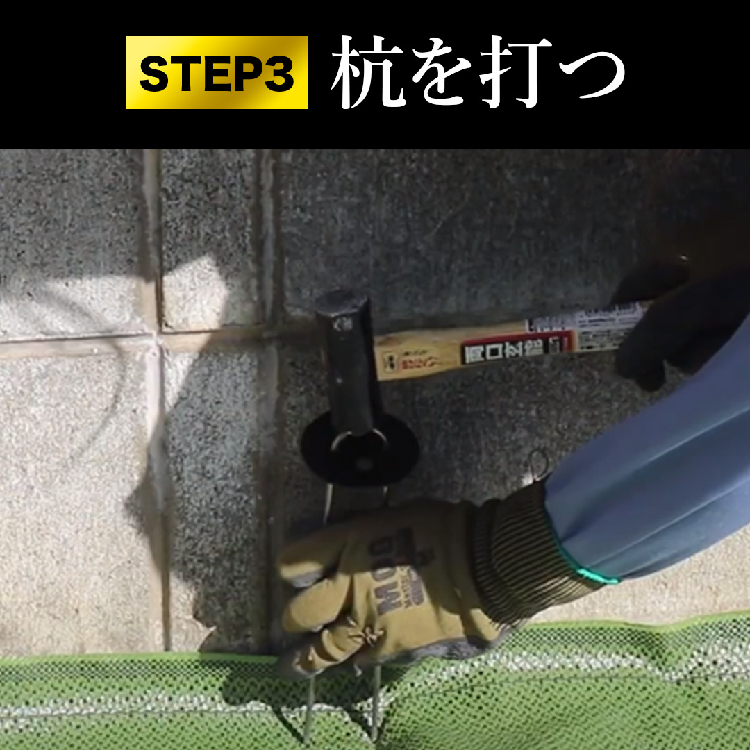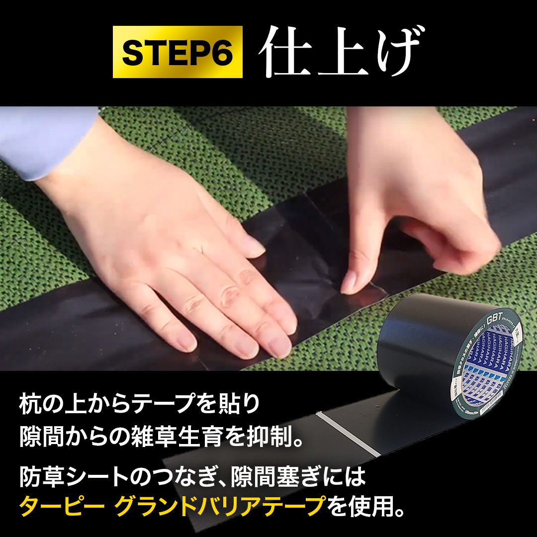 仕上げとして、杭の上からテープを貼り、隙間からの雑草生育を防ぐようにする。