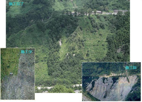 従来工法は、伐採、法面成形などが必要で、自然破壊を余儀なくされていたが、本工法は、自然斜面を固定するため、立木の根株や自然の種子等が安定的に定着するので自然の回復が計れる。